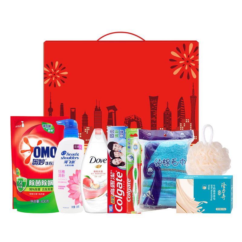 禮盒尺寸:32*8.5*24.5cm 包裝尺寸:66*46.5*51CM 產(chǎn)品配置:(香型隨機(jī)) 海飛絲洗發(fā)水300ml 多芬沐浴露300ml 奧妙洗衣液400g 隆力奇香皂95g 高露潔牙膏90g 高露潔牙刷 三重深潔 純棉毛巾73*33cm 沐浴球