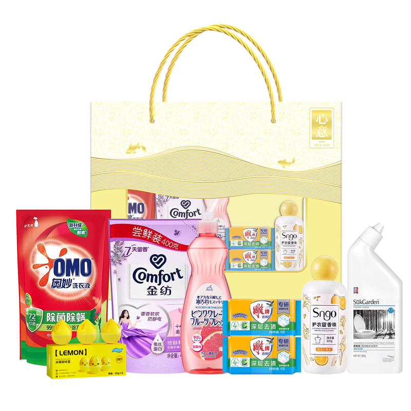 禮盒尺寸:40*13*28cm 包裝尺寸:42*80*30cm 產(chǎn)品配置:(香型隨機) 奧妙洗衣液480g 金紡柔順劑400g SNGO留香珠220g 火箭洗潔精600ml 雕牌肥皂102g 雕牌肥皂102g 冰箱除味蛋30g*3/盒 蔬果園潔廁劑500g