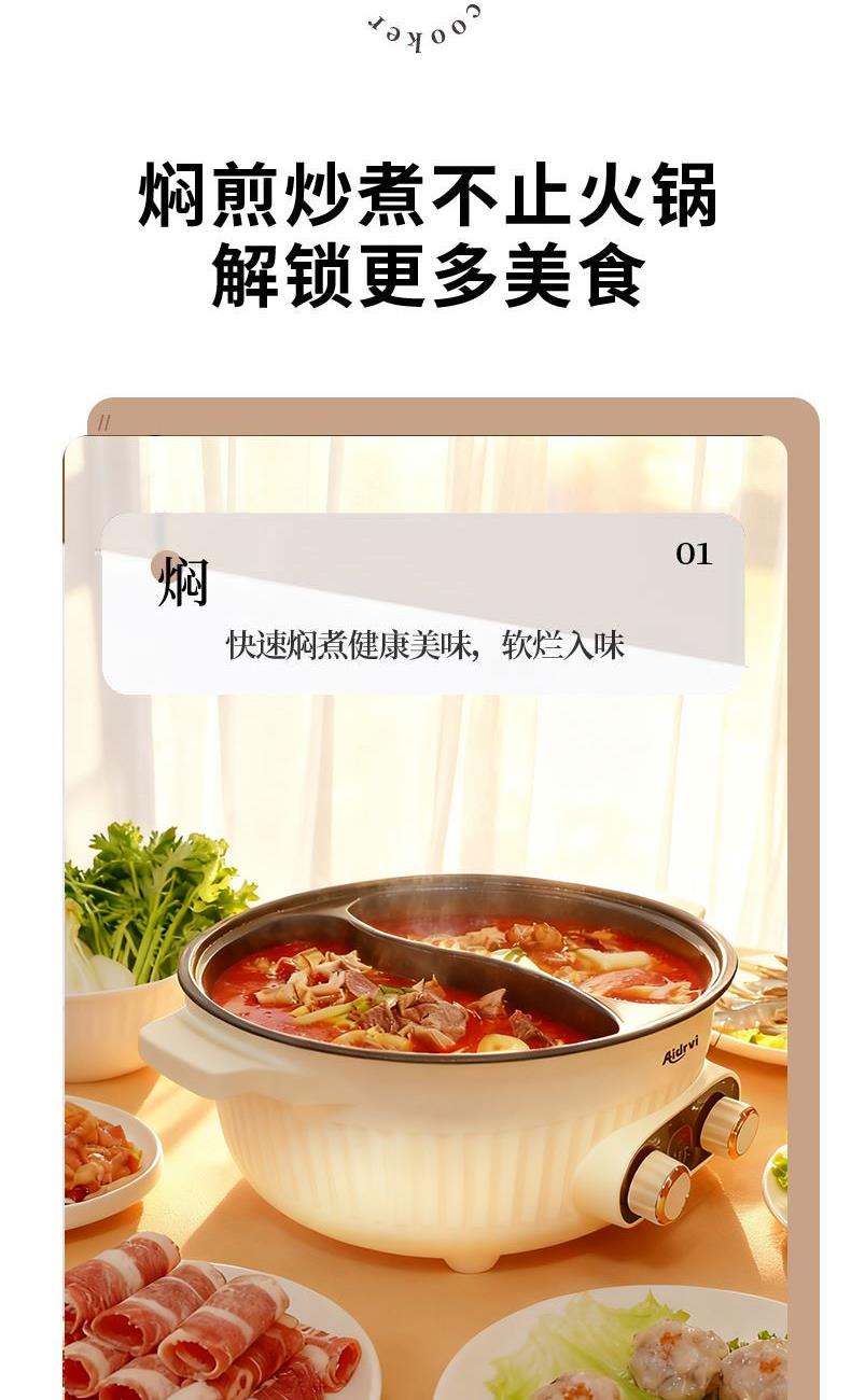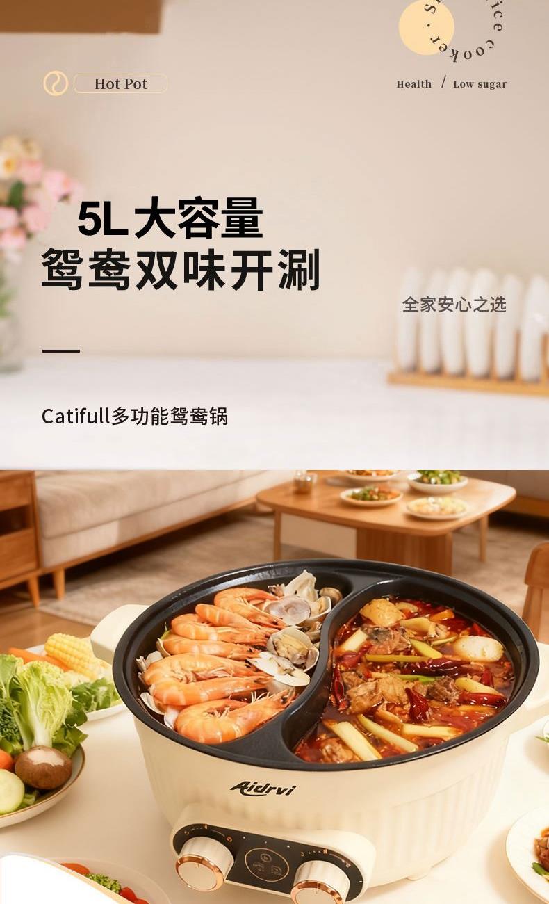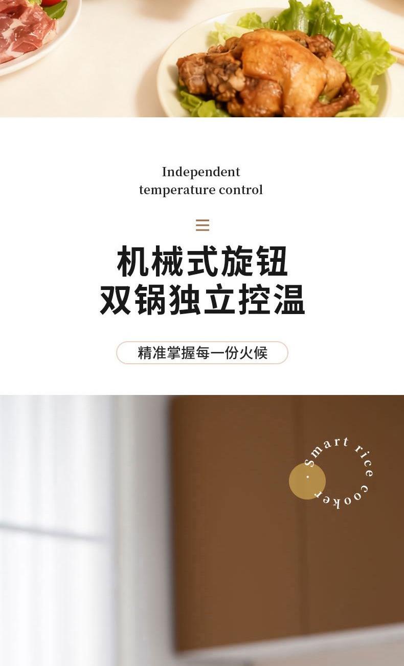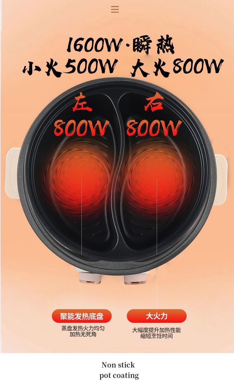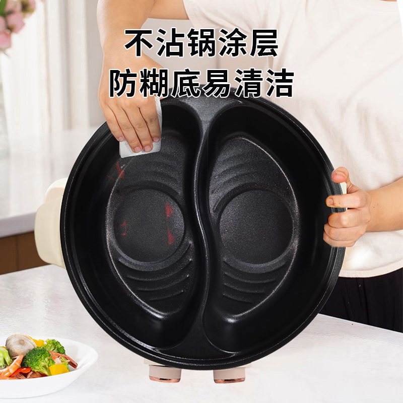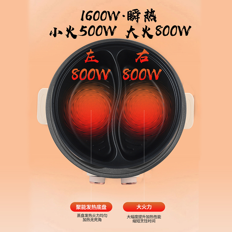 容量:5L 額定電壓:220V/50Hz 額定功率:2000W 大火單控1000W 小火單控500W 產(chǎn)品顏色:奶白色 產(chǎn)品尺寸:220*360*385mm特色功能: 加長(zhǎng)加大深鍋,5L大容量涮煮更盡興 雙旋鈕獨(dú)立控制,分區(qū)明確兩不誤 鴛鴦雙味,一鍋共享,滿足多人口味需求 總2000W大火力,快涮速煮,美味不誤時(shí) 不粘涂層,烹煮涮拒絕糊底 一沖即凈,餐后清潔輕松搞定 分區(qū)調(diào)溫,適合2-10人聚餐