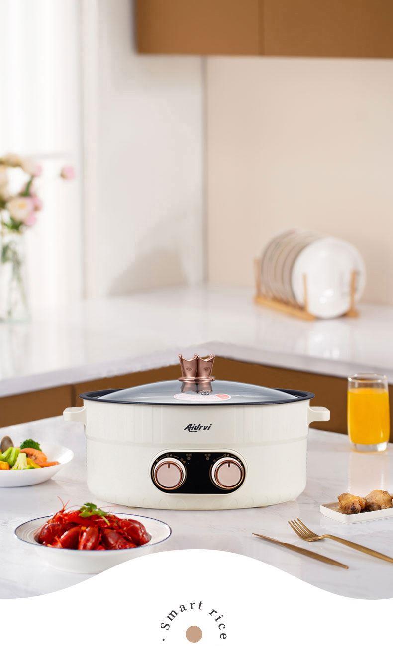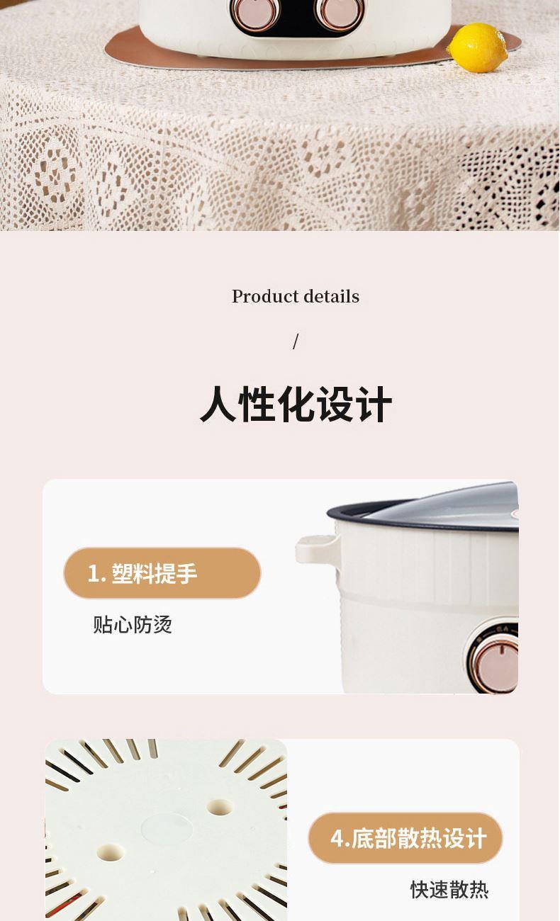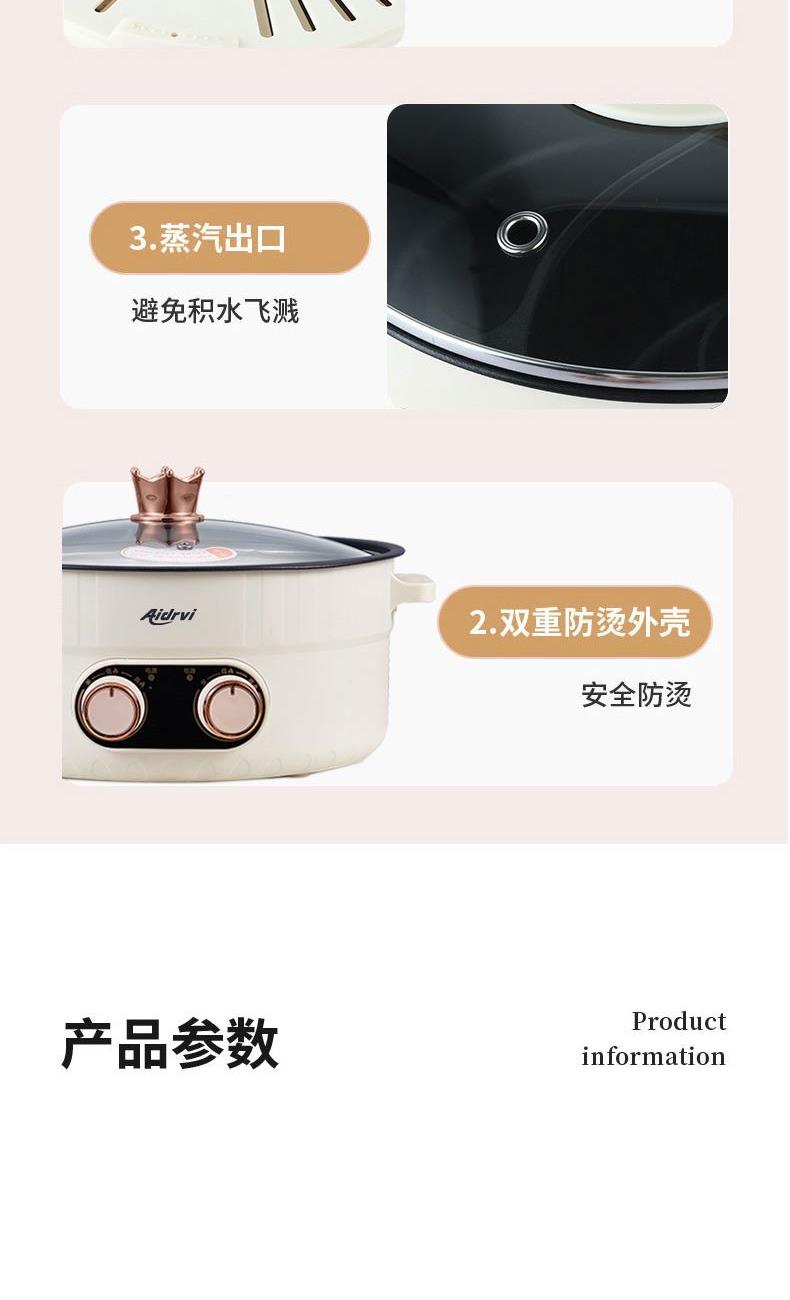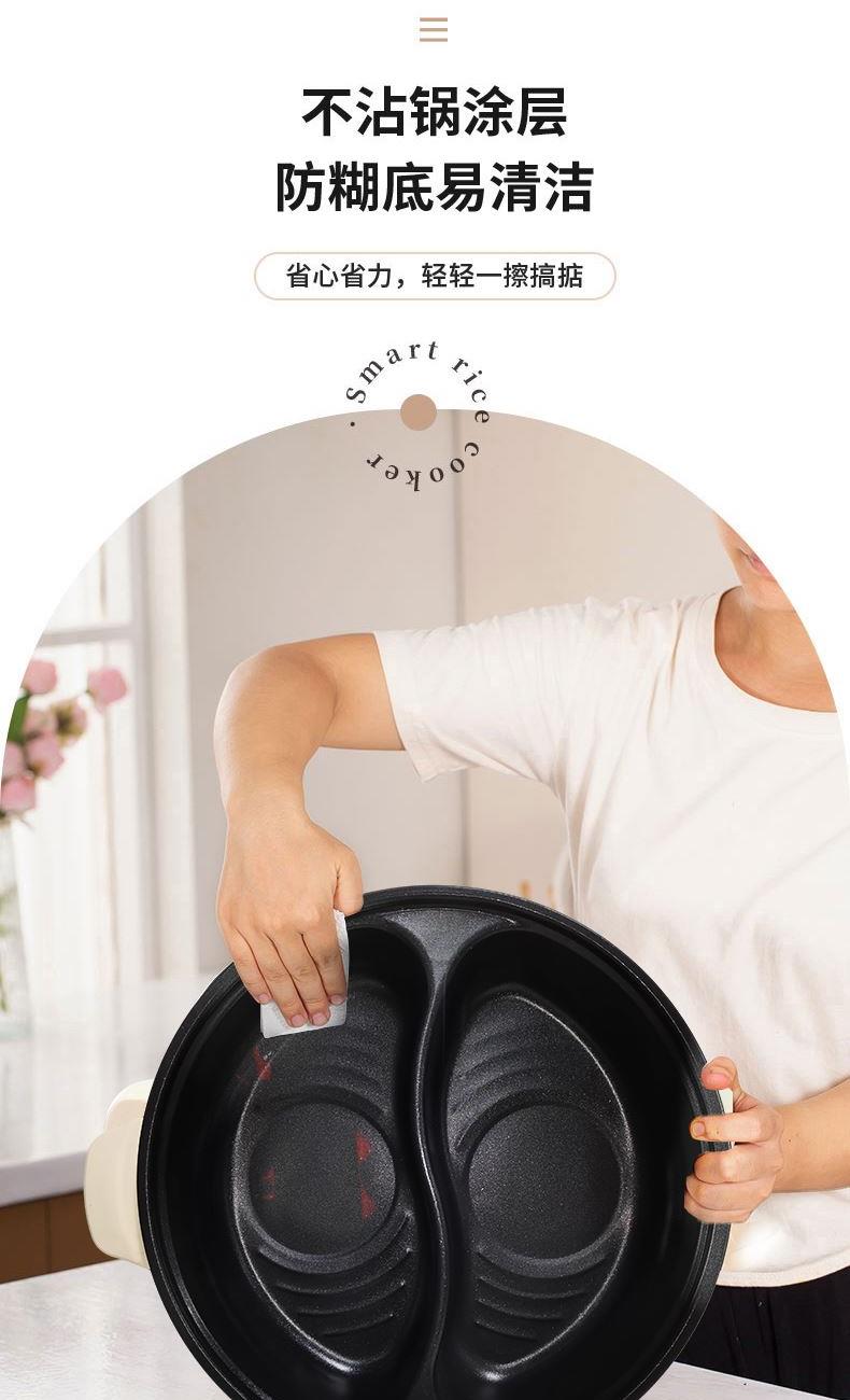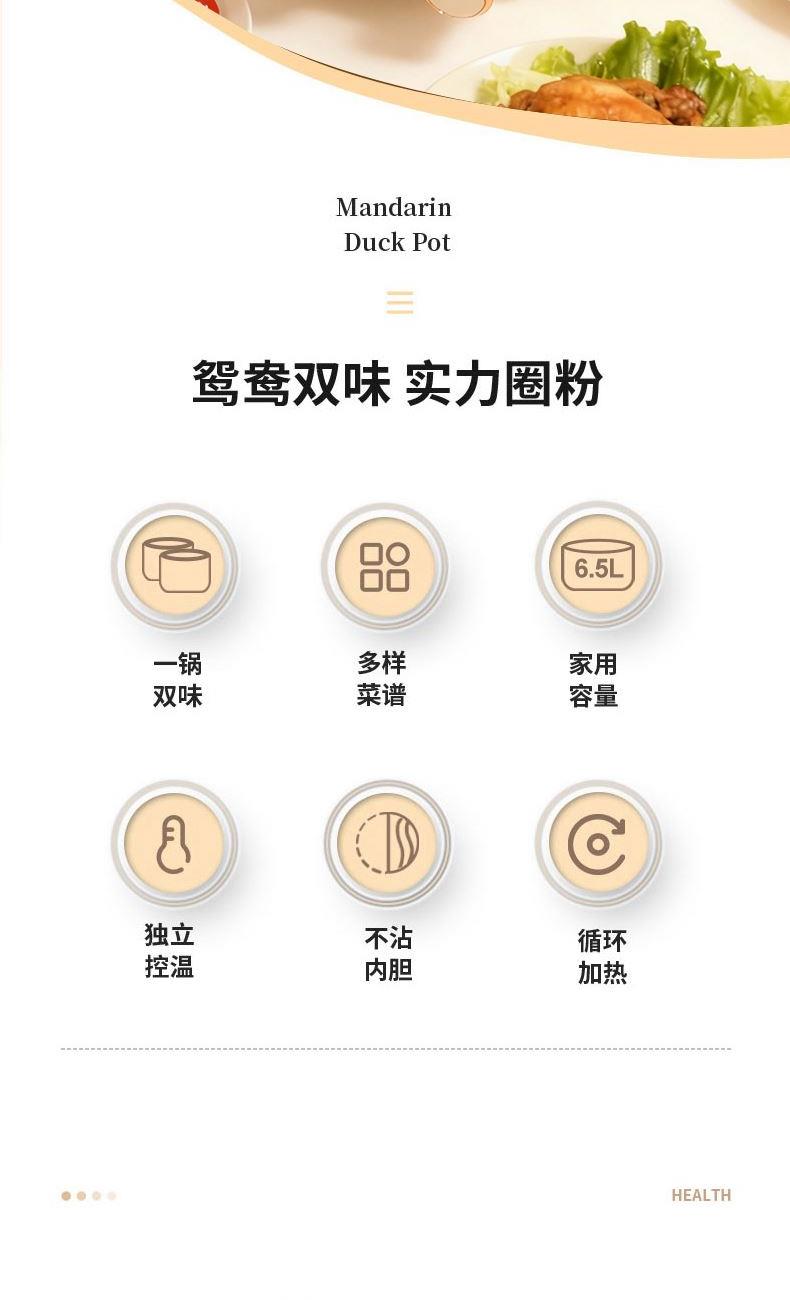容量:5L 額定電壓:220V/50Hz 額定功率:2000W 大火單控1000W 小火單控500W 產(chǎn)品顏色:奶白色 產(chǎn)品尺寸:220*360*385mm特色功能: 加長(zhǎng)加大深鍋,5L大容量涮煮更盡興 雙旋鈕獨(dú)立控制,分區(qū)明確兩不誤 鴛鴦雙味,一鍋共享,滿足多人口味需求 總2000W大火力,快涮速煮,美味不誤時(shí) 不粘涂層,烹煮涮拒絕糊底 一沖即凈,餐后清潔輕松搞定 分區(qū)調(diào)溫,適合2-10人聚餐